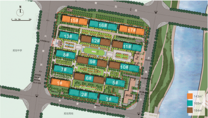 如意府西临众意西路、北临朝阳路、南接春雷路,东临龙腾三街。项目总占地面积约83亩,总建筑面积约9.4万㎡,容积率为1.69,中国金茂在郑州打造的第二座打科技住宅。 总共规划了5排,15栋住宅,544户,三个主力户型, 143㎡、165㎡、185㎡,均为四房户型,配置约800平方会所,整体设计为地上地下各一层,设有水吧、书吧、艺术、亲子、健身等功能; 社区东南侧配备9班幼儿园,建筑面积约2970平方米。